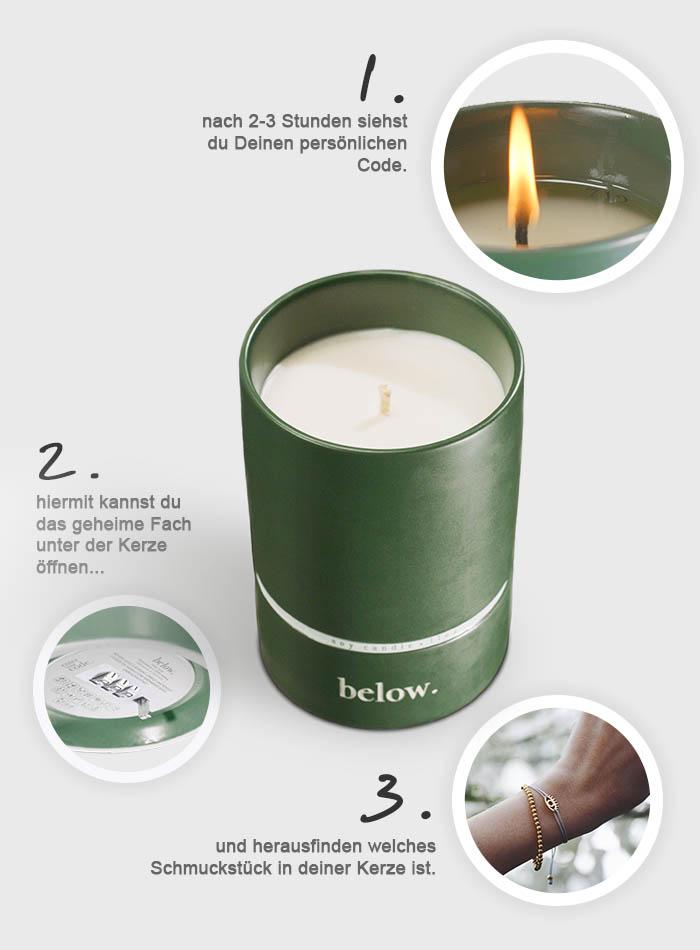 Unsere below.-Kerzen sind nicht einfach "nur" Duftkerzen. Zusätzlich zur Kerze findest Du im Boden der Kerze verschiedenste Schmuckkombinationen, die Du mittels des Codes auf der Innenseite der Kerze entdecken kannst.